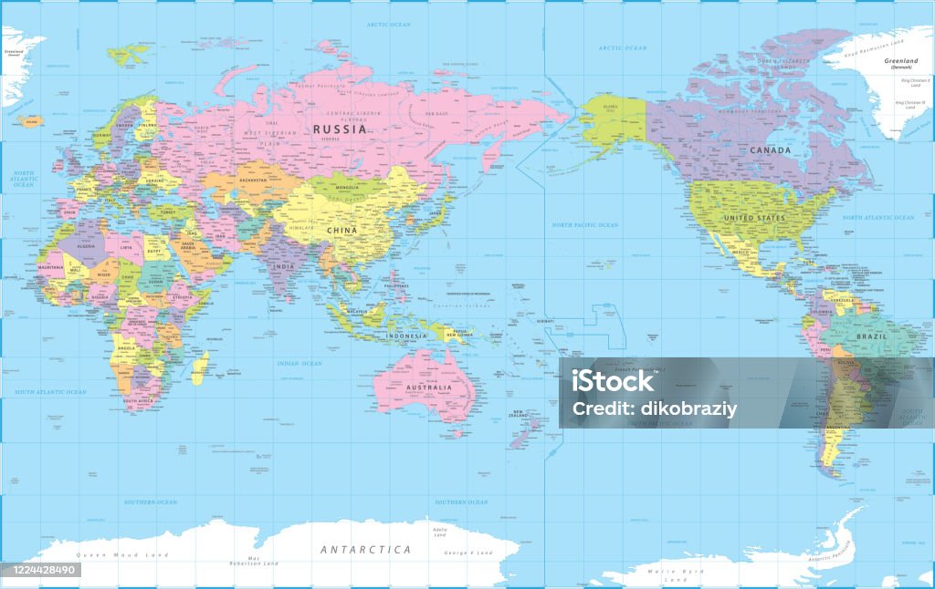 World Map Pacific View Asia China Center Political Topographic